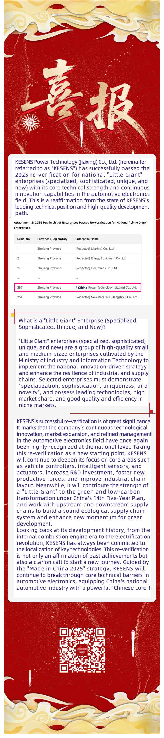 KESENS has obtained national level certification again! Successfully passed the review of the 2025 specialized, refined, and new "Little Giant" enterprise