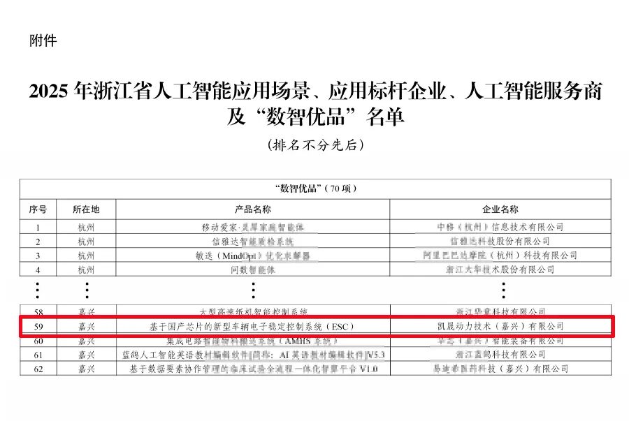 近日,浙江省经济和信息化厅下发通知,凯晟公司自主研发的基于国产芯片的新型车辆电子稳定控制系统(ESC)成功入选浙江省“数智优品”名单。