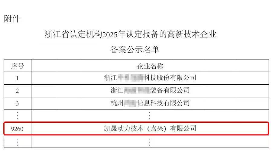 近日,全国高新技术企业认定管理工作领导小组办公室对浙江省2025年高新技术企业备案名单进行了公示。凯晟动力技术(嘉兴)有限公司(以下简称“凯晟”)成功通过2025年高新技术企业复审,延续了国家级创新资质认证。